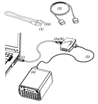 - Connect the provided USB cable to your computer and the NeXus-32 using the micro USB and Fusbi adapter. As shown in diagram, connect the USB cable (1) to a USB input on the computer. Connect the micro USB cable (2a) to the Fusbi micro USB (2b). Connect the optical fiber (3) to the input of the Fusbi and the other end to the fiber connector on the back of the NeXus-32 (4).